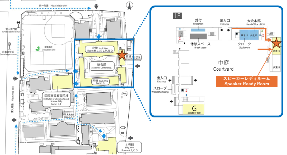 - 発表者は会場内に設置されるスピーカーレディルーム(総合館1階東棟の共東12)にて事前に、発表用のPowerPoint,PDFファイル等を発表用PCへとご自身で登録していただく必要があります。