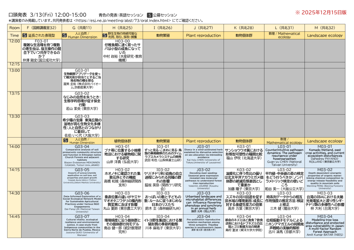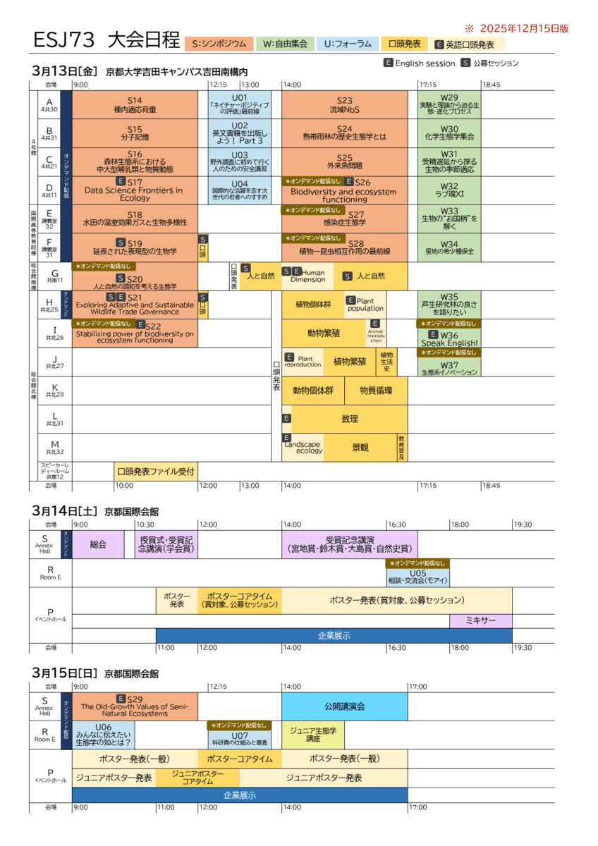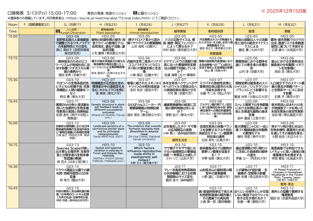 - プログラムの詳細は生態学会の大会講演要旨閲覧ページから閲覧可能です。各発表の要旨は現在準備中です。
