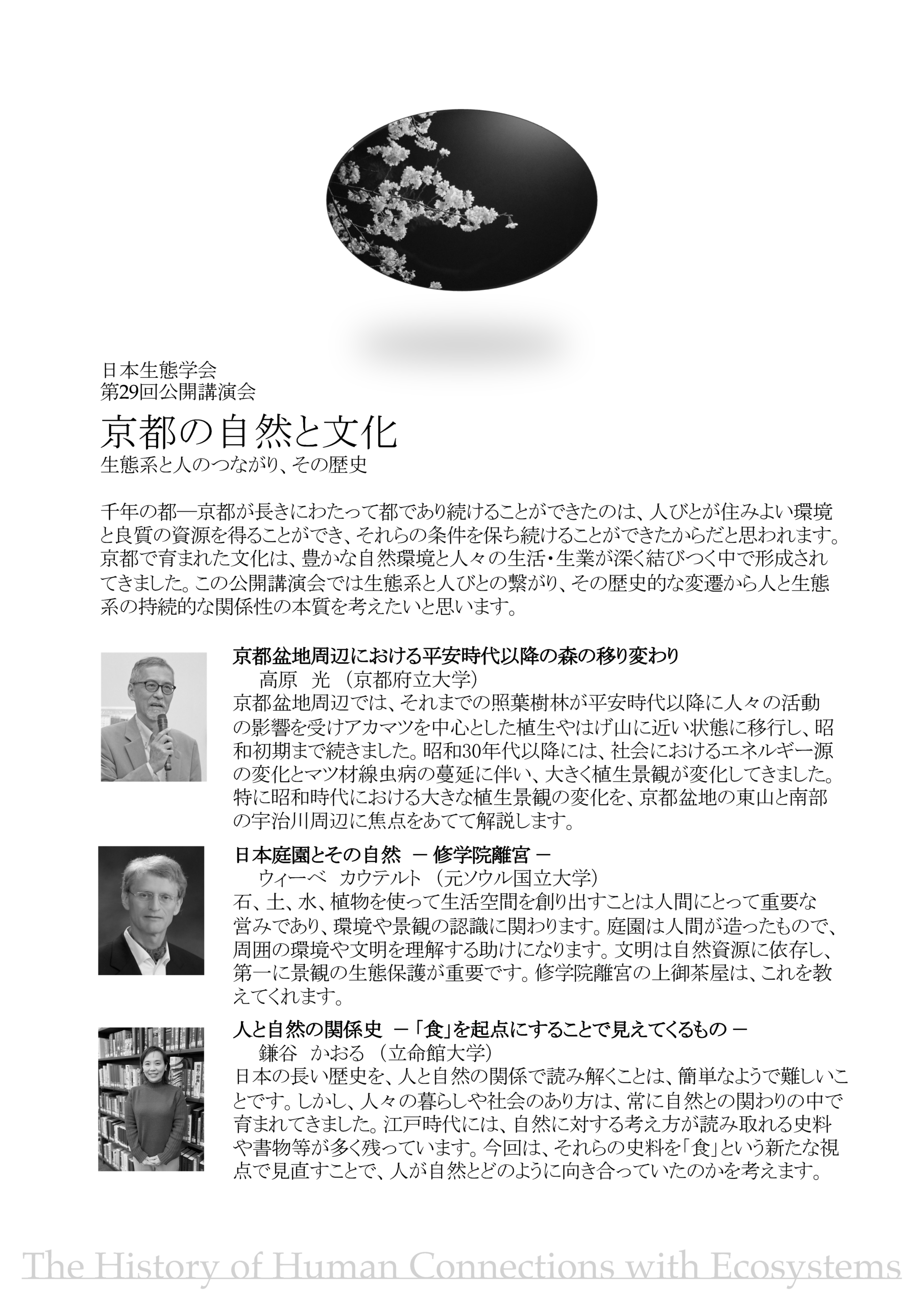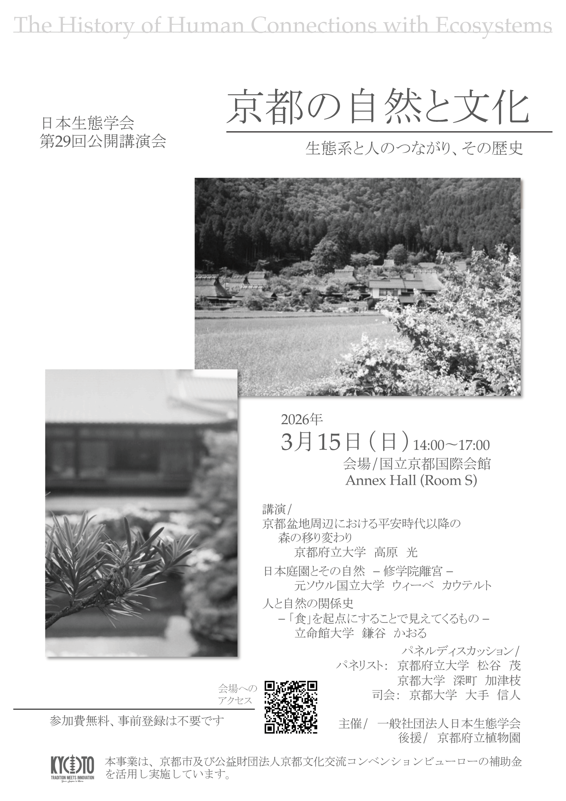 千年の都―京都が長きにわたって都であり続けることができたのは、人びとが住みよい環境と良質の資源を得ることができ、それらの条件を保ち続けることができたからだと思われます。京都で育まれた文化は、豊かな自然環境と人々の生活・生業が深く結びつく中で形成されてきました。この公開講演会では生態系と人びとの繋がり、その歴史的な変遷から人と生態系の持続的な関係性の本質を考えたいと思います。